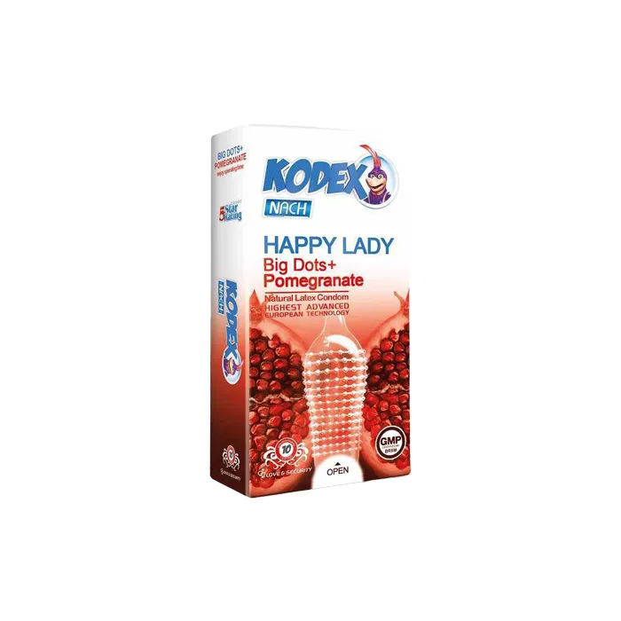 کاندوم خاردار کدکس مدل هپی لیدی با داشتن عصاره انار باعث تنگ شدن واژن خانم‌ها شده تا آماده یک دخول هیچان انگیز باشند. از طرف دیگر وجود خارهای بسیار درشت در سرتاسر دیواره این کاندوم، هنگام دخول، برای خانم‌ها بیشترین شادی و اورگاسمی بی‌نظیر را به همراه خواهد داشت.