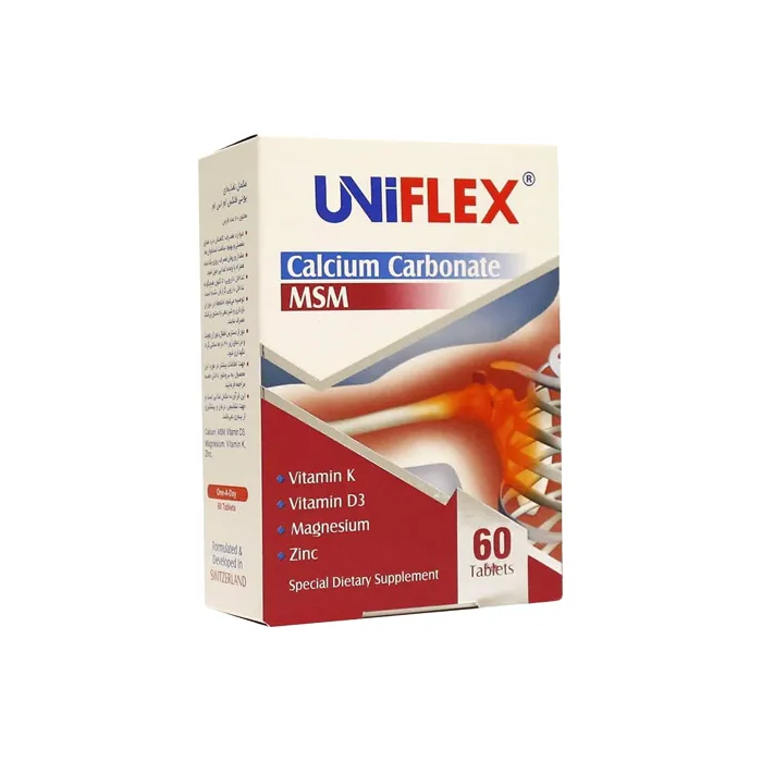 قرص یونی فلکس MSM لیبرتی سوئیس (Uniflex Calcium Carbonate) دارای فرمولاسیونی متشکل از کلسیم، متیل سولفونیل متان (MSM)، منیزیم، روی، ویتامین D3 و ویتامین K1 است. مصرف این محصول موجب پیشگیری از ابتلا به بیماری آرتریت (Arthritis) شده و به طور چشمگیری به کاهش دردهای ناشی از این بیماری کمک می کند.