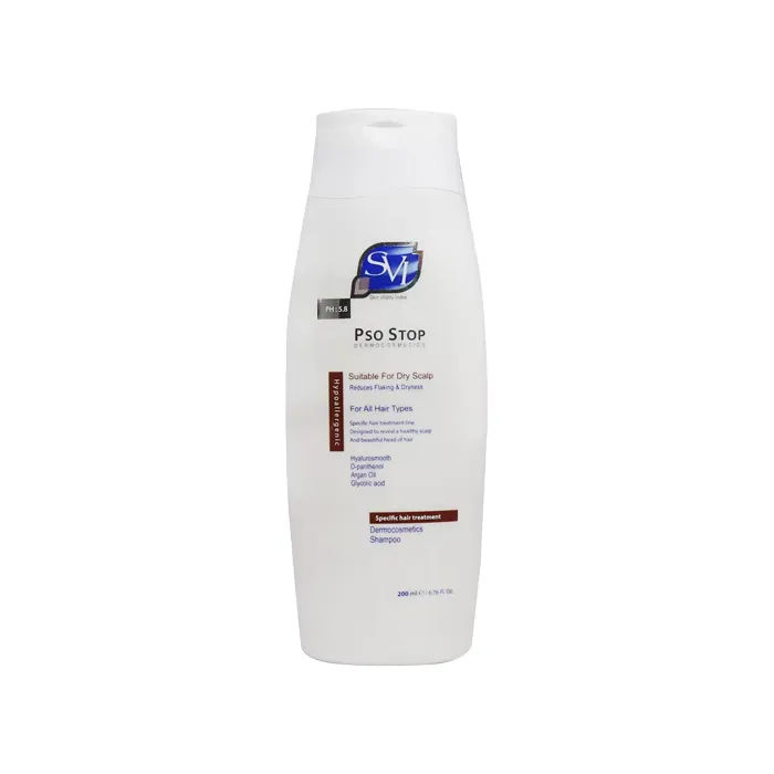 شامپو پسو استاپ اس وی آی (ضد شوره) یک شامپوی شوینده موی سر است که به خوبی کف سر را تمیز نموده و با بهره‌گیری از فرمولاسیونی ملایم به نحو موثری پوسته ریزی را کاهش می‌دهد و موها را با طراوت و دلپذیر می‌کند. گلایکولیک اسید موجود در شامپو PSO STOP اس وی آی موجب شده تا افراد مبتلا به پسوریازیس این شامپو را برای درمان پوسته ریزی کف سر انتخاب کنند. این شامپوی ایرانی به آبرسانی قوی و بهبود خشکی کف سر کمک فراوانی می‌کند و رطوبت طبیعی را به موهای شما بازمی‌گرداند. این محصول حاوی روغن آرگان بوده و ضمن رفع التهابات به تقویت ساقه موها نیز کمک می‌کند. از طرفی گلایکولیک اسید نوعی جوان ساز برای پوست سر محسوب می‌شود و پوست سر را از چربی اضافه، عوامل باکتریایی و قارچ به خوبی پاکسازی می‌کند.